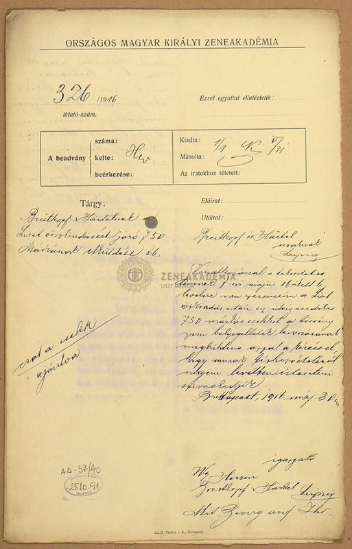 A Zeneakadémia igazgatójának feljegyzése a Breitkopf és Härtel cégnek 750 márka elküldéséről.