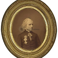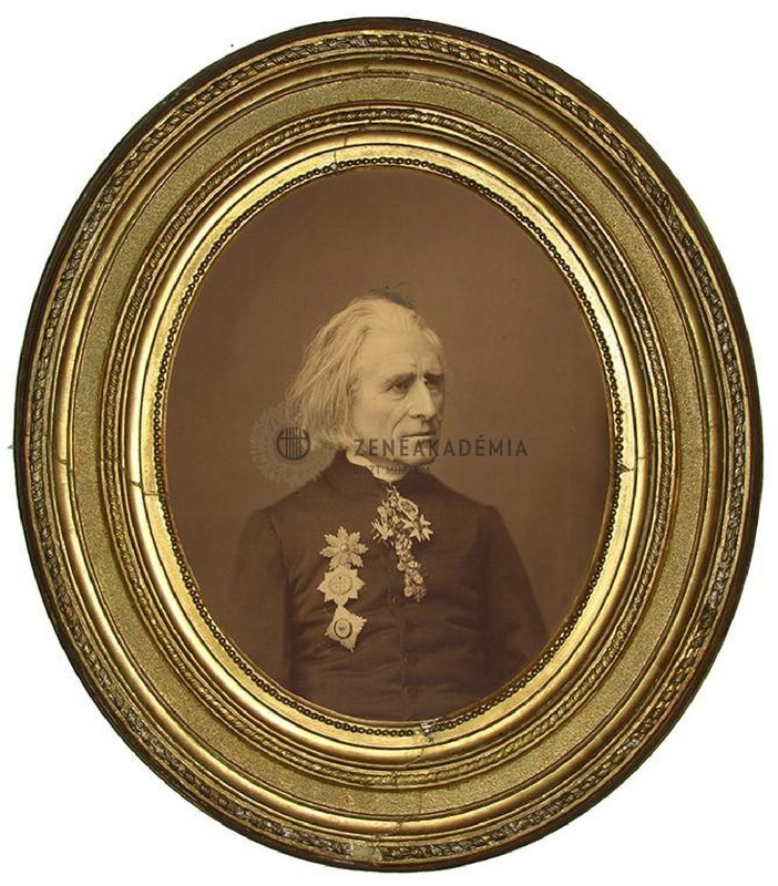 Liszt Ferenc reverendát visel, mellét számos érdemrend díszíti. Korabeli ovális képkeretben.