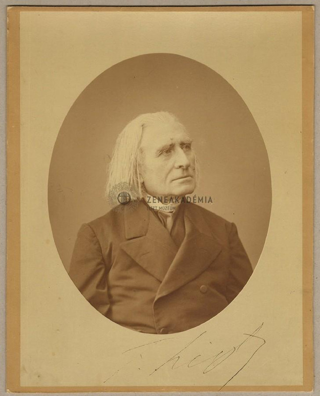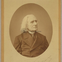 Az idős Liszt Ferenc ovális alakú mellképe. A karton hátlapon alul Liszt sajátkezű aláírása: "F. Liszt."