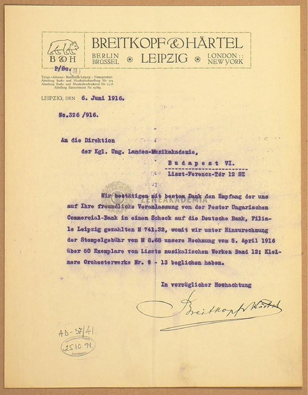 A Breitkopf és Härtel cég levele a Zeneakadémia igazgatóságának arról, hogy a Liszt-összkiadás 12.kötetéért átutalt összeget, 750 márkát megkapták-bélyegilletékkel együtt-, így az 1916.04.05-ei számlát kiegyenlítettnek tekintik.