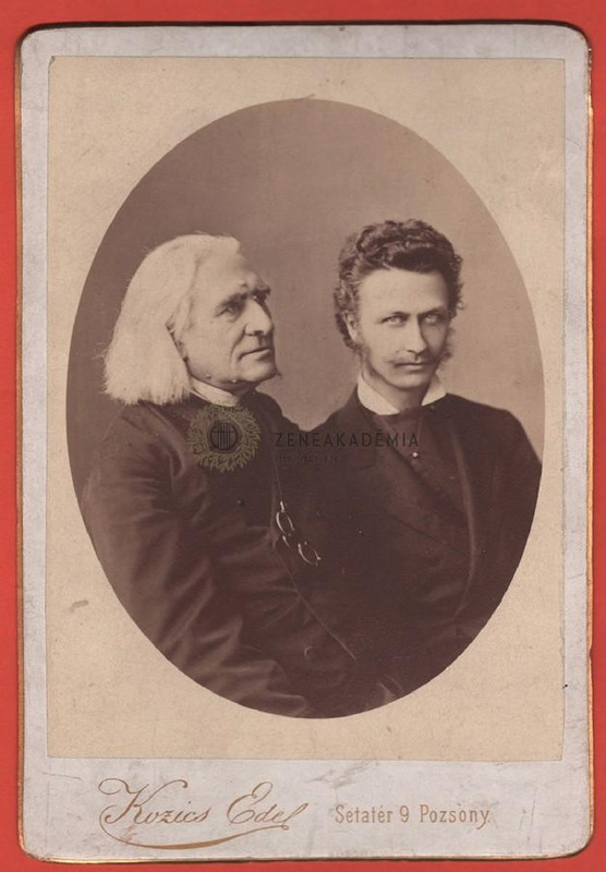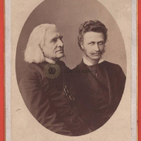 Az abbéruhás idős Liszt és Zichy Géza ovális alakú mellképe téglalap alakú céges hátlapon.