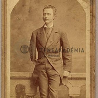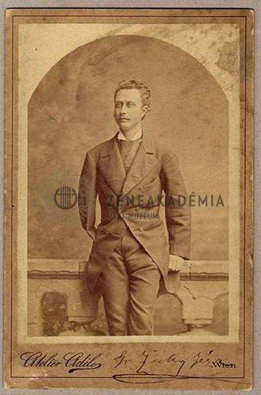 Gróf Zichy Géza térdképe, a művész kőkorlátnak támaszkodik. A fénykép alján céges adatok:"Atelier Ad?le Wien", és Zichy Géza sajátkezű aláírása.