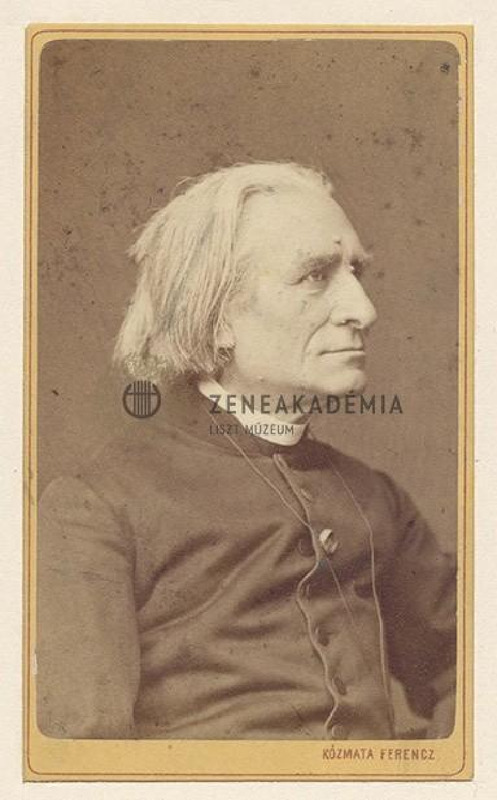 Az F 0415 számú fénykép kisebb kivágata. Liszt Ferenc abbéruhás derékképe, fekete szegélyű állítható, üveges keretben. Liszt faragott asztalnál ül, jobb kezében lúdtoll.