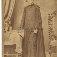Az abbéruhát és talárt viselő Liszt teljes alakú képe. Liszt balra fordulva díszes szék mellett áll és ujjával egy asztalon fekvő könyvre támaszkodik.