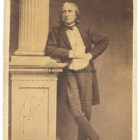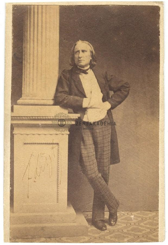 A művész kabátot, csokornyakkendőt és kockás nadrágot visel, és könyökével egy oszlop talapzatára támaszkodik. A talapzaton Liszt aláírása látható. A kép hátán sajátkezű megjegyzés:"Obschon stehend, doch sitzend bleibend."