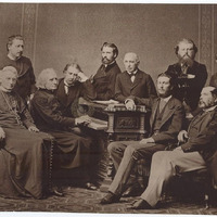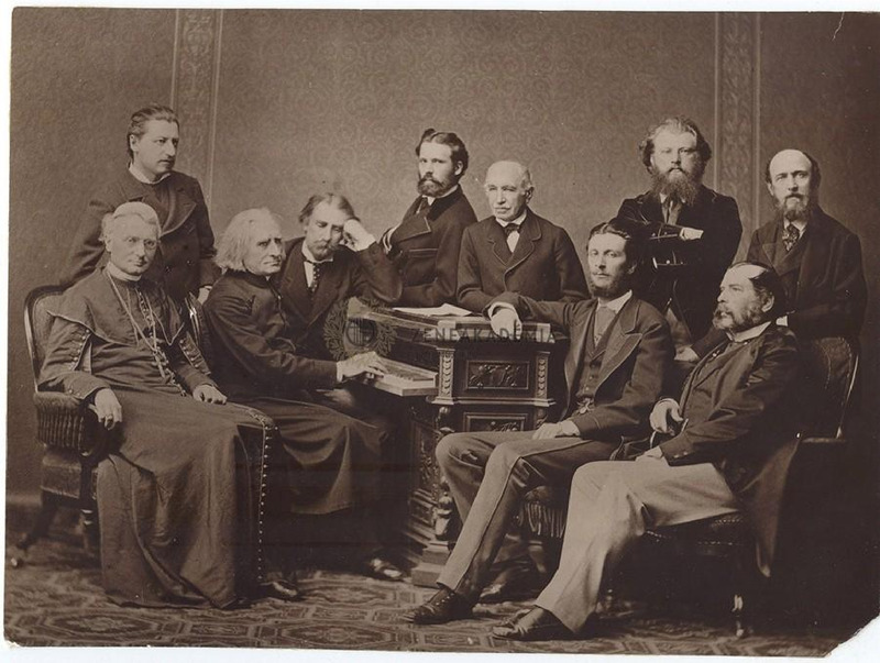 - Liszt Ferenc abbé ruhában a zongoránál ül, körülötte ülnek:Haynald Lajos, Széchényi Imre, Apponyi Albert, Karátsonyi Guidó. Állnak: Huszár Imre, Mihalovich Ödön, Augusz Antal, Richter János, Dunkl Nepomuk János. Felül tintával ráírták: "Fünfzigjähriges Liszt-jubileum 1873."