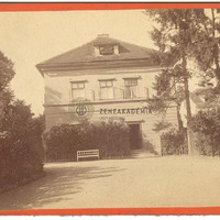 Az épületet a bejárat felőli oldalról, a park egy részletével mutatja. A felvétel kissé oldalra dől. Üveges állítható keretben.
