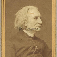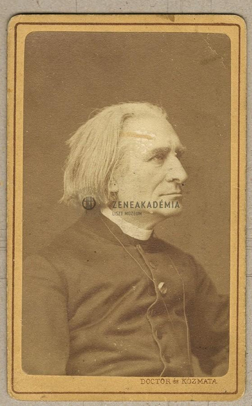 Az F 0415 számú fénykép kisebb kivágata. Liszt Ferenc abbéruhás derékképe. Liszt faragott asztalnál ül, jobb kezében lúdtoll.