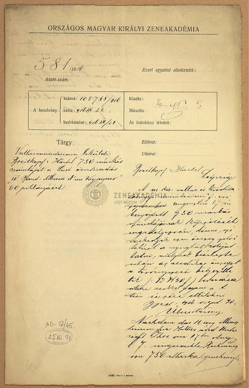 A Zeneakadémia feljegyzése 750 márka megküldéséről a Breitkopf és Härtel cégnekLa iszt-összkiadás 4. kötetének (Album dun Voyageur) költségeként.