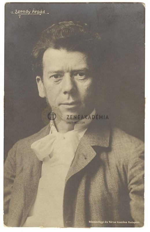 A középkorú Szendy Árpád álló galléros ingben, fehér selyemkendővel, kigombolt kabátban. A fénykép bal felső sarkában felirat: "Szendy Árpád" A jobb alsó sarokban: "Rózsavölgyi és Társa kiadása Budapest".