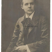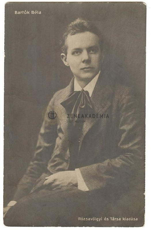Képeslap, az ifjú Bartók zakós, csokornyakkendős térdképe. Feliratok:Bartók Béla (bal felső sarok) Rózsavölgyi és Társa kiadása (jobb alsó sarok).
