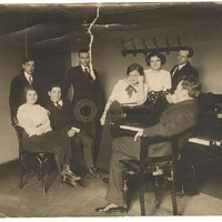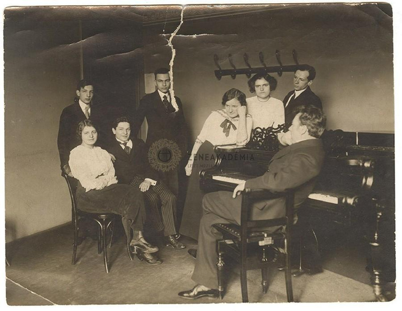 Zsigmondy Gábor osztályának diákjai a Zeneakadémia egyik tantermében. A zongoránál Zsigmondy Gábor, körülötte négy férfi és három nőtanítvány, köztük Kabos Ilona és Lázár Margit. A fénykép hátán piros céges pecsét: Szőnyi Lajos felvétele, Bpest, Bethlen u. 41. sz. További kéziratos megjegyzés: "1914-es évekből, amikor Lázár Margit unokanővérem a zong. tanári szakot végezte".