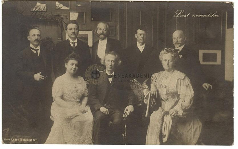 Levelezőlap, Liszt nyolc növendékét ábrázolja, akik az 1911-es ünnepségeken részt vettek. A kép jobb felső sarkában: "Liszt növendékei". Alul baloldalt: "Foto Labori Budapest 1911"Balról jobbra ülnek: Vera Timanova, Emil Sauer, Göllerichné Voigt Gizella. Állnak: Thomán István, Bernhard Stavenhagen, August Göllerich, Szendy Árpád, Martin Krause.