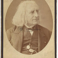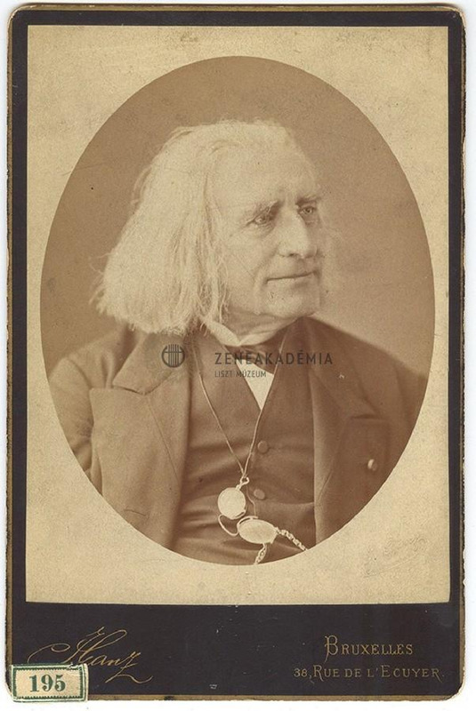 Az idős Liszt ovális alakú fényképe téglalap alakú hátlapon. A művész kabátban, szemüvege láncon függ. A paszpartun cégjelzés: J. Ganz Bruxelles 38, Rue de lEcuyer
