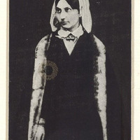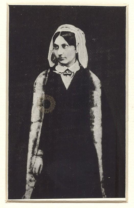 A fiatal Carolyne sötét ruhában, csuklyás köpenyben áll. Üveges keretben.