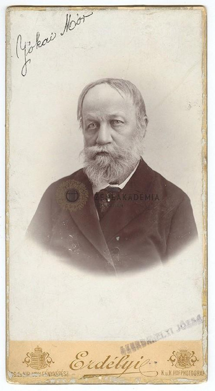 Az idős író kabátot visel. A kép céges hátlapon a kép alatt aranyozott magyar és osztrák címerek között arany betűkkel cégjelzés: Erdélyi, CS. ÉS KIR. FÉNYKÉPÉSZ, K. u. K. HOFPHOTOGRAPH. A fénykép bal felső sarkában tintás kézírás: "Jókai Mór".
