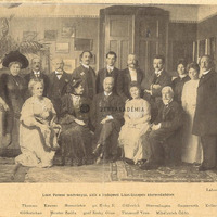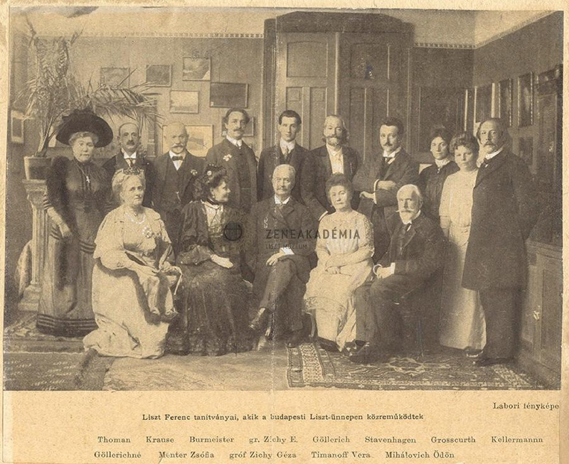 Liszt Ferenc tanítványai, akik az 1911-ben szervezett budapesti Liszt-ünnepen közreműködtek. A növendékek 2 sorban helyezkednek el egy képekkel teleaggatott teremben. Ülnek: (balról jobbra) Göllerichné Voigt Gizella, Sofie Menter, gr. Zichy Géza, Vera Timanova, Mihalovich Ödön. Állnak: ismeretlen kalapos hölgy, Thomán István, Martin Krause, Willy Burmeister, gr. Zichy E., August Göllerich, Bernhard Stavenhagen, Grosscurth, ismeretlen hölgy, Berthold Kellermann. A nyomat alatt a taníványok neve nyomtatásban szerepel. Ugyanott kézirásos bejegyzés: "1911.XI.5."