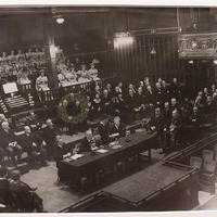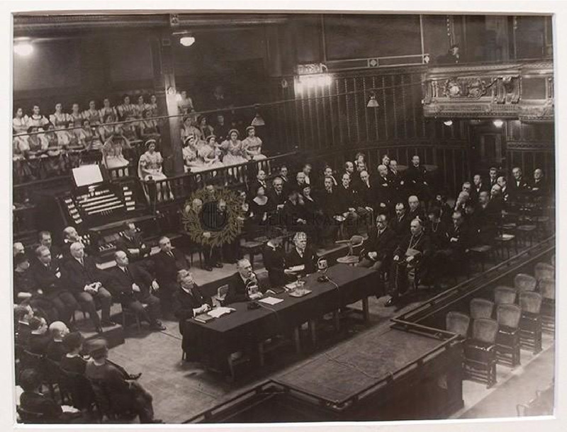 A Zeneakadémia dísztermének színpadán az asztalnál négytagú bizottság ül, közöttük Hubay Jenő igazgató. A színpad többi részén meghívottak. Az orgona mögött díszmagyarba öltözött lányok ülnek.