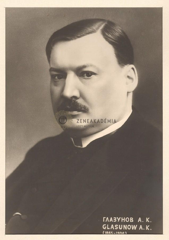 A zeneszerző kicsit balra fordul, majdnem szembe néz. Fekete öltönyt visel, alatta fehér inget. A jobb alsó sarokban cirill és latin betűkkel: "Glasunov, A. K. (1865-1936)"