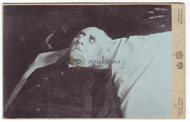 A halott Liszt derékképe. A Held által kiadott vintázs-kópia a Bayreuth-i Hans Brand 1886 augusztus elsején készített fényképe nyomán készült 1888. után. A karton alaplapon a fénykép alatt Held adatai: LOUIS HELD Hof-Photograph. WEIMAR Marienstrasse 1.