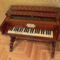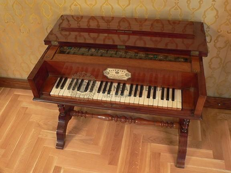 Hangolt üveglapokat megszólaltató zongora mechanika mahagóni szekrényben, esztergályozott lábakon.