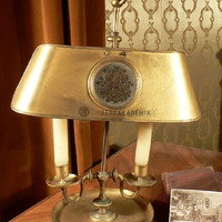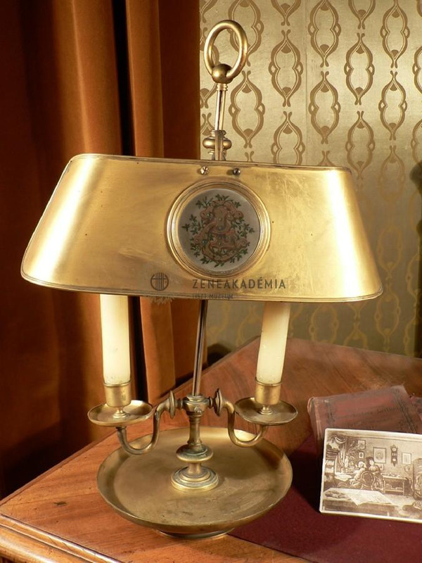 Kétágú gyertyatartó féloldalas ernyővel. Aranyozott fém. Az ernyő közepén, keretezett műcsontlapon festett "EL" monogram.
