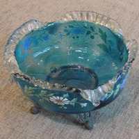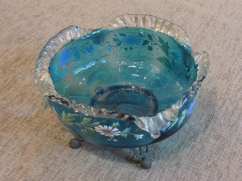 - Kék üveg, ráégetett festett díszítéssel, fém talpazaton.