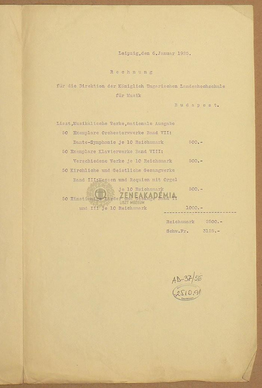 A Breitkopf és Härtel cég számlája a Zeneakadémia igazgatóságának a Liszt-összkiadás 2., 3., 7. és 8. köteteiről, 50-50 példányban. (2500 márka)