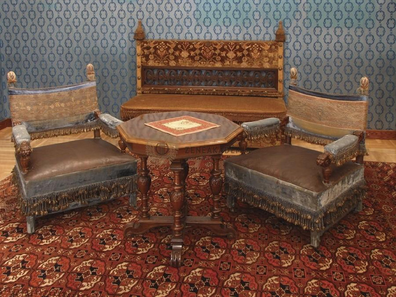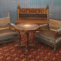 Neoreneszánsz stílusú, nyolcszögű asztal, faragott és esztergályozott diófa.