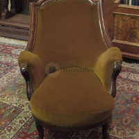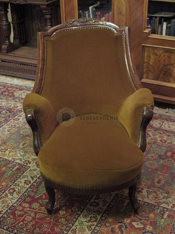 - Szövettel kárpitozott karosszék, az újabb kárpit középbarna színű.