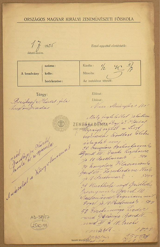 Másolat a Zeneakadémia könyvtárosának. A Zeneakadémia igazgatójának levele a vallás-és közoktatási miniszternek a Liszt-összkiadás 2.,3.,7. és 8. kötetével kapcsolatban. Kézírásos.