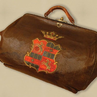 Préselt barna marhabőr, oldalán Liszt hímzett lovagi címere. Felül fémkeretes zárral, bőr fogantyúval.