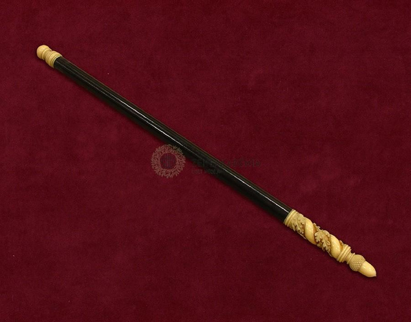 Henger alakú ébenfa és elefántcsont pálca, esztergályozott és faragott díszítéssel.