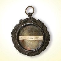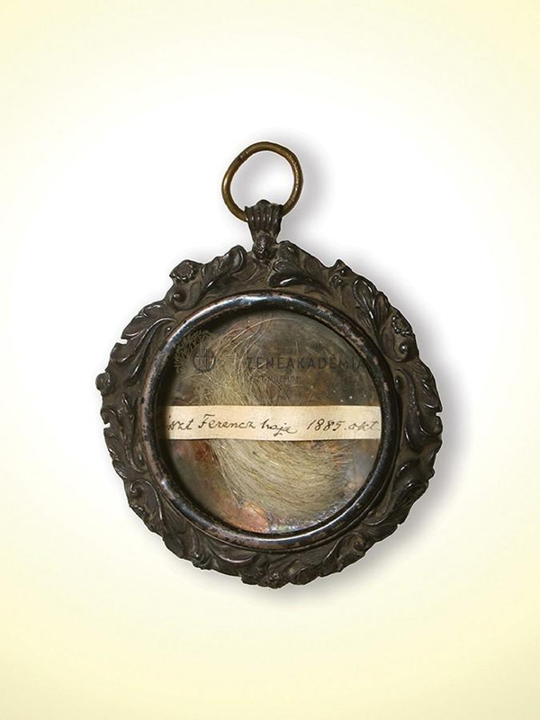 A 74 esztendős Liszt ősz hajfürtje ezüst foglalatban. Benne papírszelet a következő felirattal: "Liszt Ferencz haja 1885 okt".