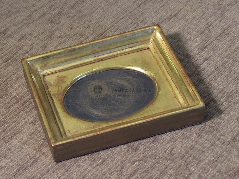 A 15 éves Liszt Ferenc sötétszőke hajfürtje aranyozott keretben. A hátoldalon tanúsítvány Varga Vilmától.