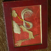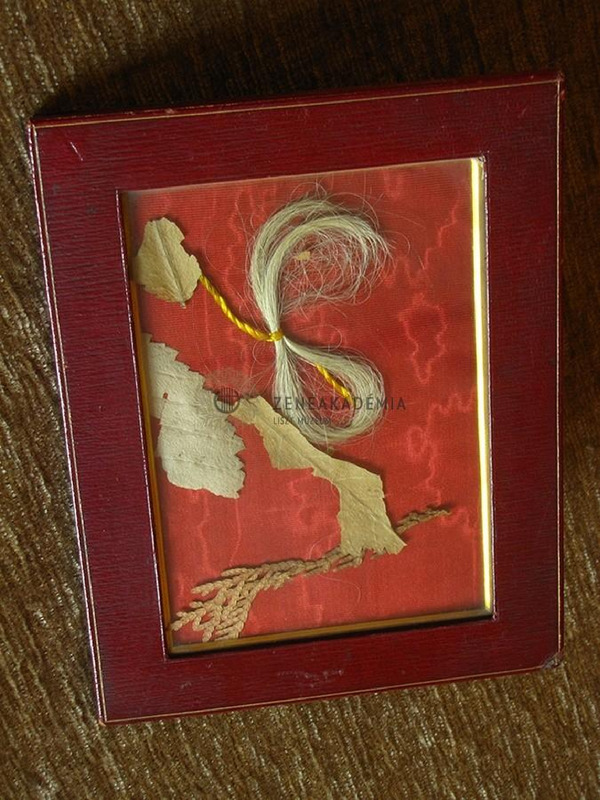 Ősz hajfürt, amelyet Liszt halála után vágtak le. Újabb (20. századi) keretbe foglalva szárított zöld levelekkel egy halotti koszorúról.