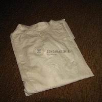 - Fehér lenvászon, géppel varrott. Hátrésze rakott kialakítású, a mellrész középig nyitott. Gallér helyett oroszos zárószegély.