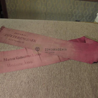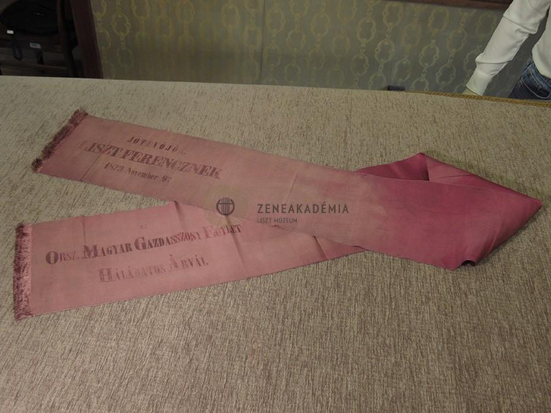 Bíborszínű selyemripsz szalag feketére oxidálódott ezüst felirattal: "JÓTEVŐJÖK: LISZT FERENCNEK 1873 NOVEMBER 9-én - AZ ORSZ. MAGYAR GAZDASSZONY EGYLET HÁLÁDATOS ÁRVÁI"