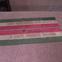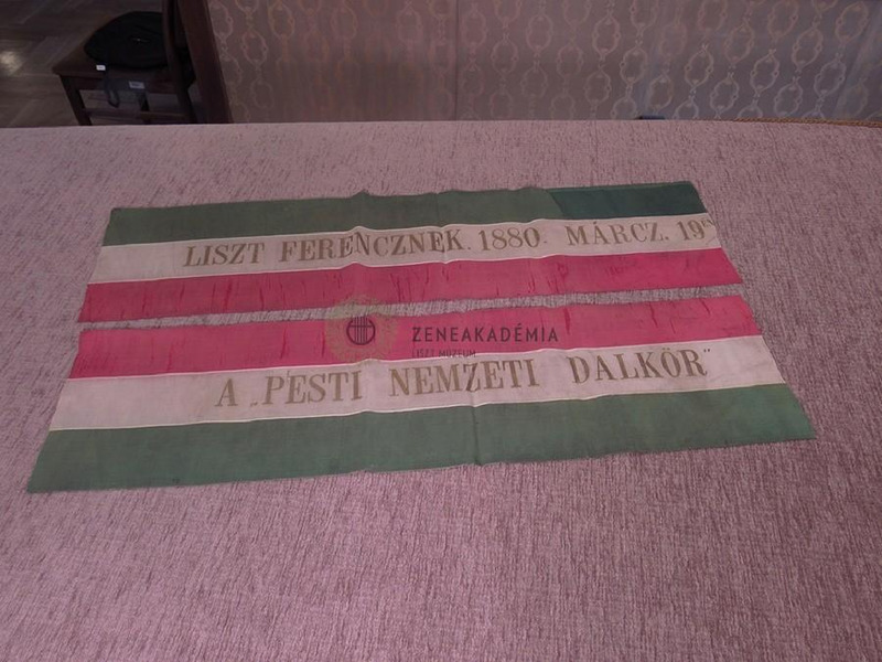 Nemzeti színű selyem szalag arany felirattal: "LISZT FERENCZNEK. 1881. Márc. 19. A PESTI NEMZETI DALKÖR"