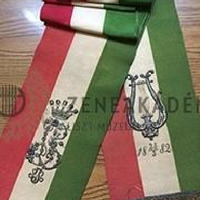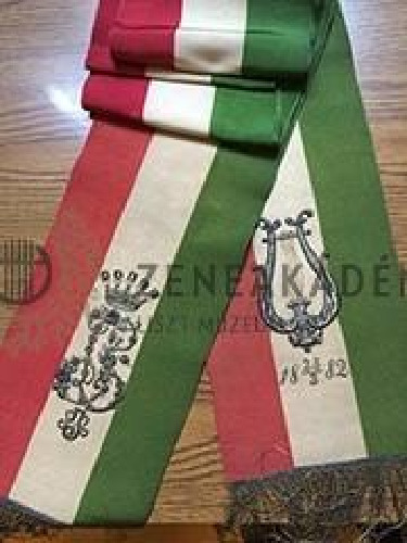 Nemzeti színű selyem ripsz szalag ezüst rojtozással és két végében ezüst színű hímzéssel: 1) LF monogram ötágú koronával, alatta JM 2) lyra és 1882 25/3 dátum.-