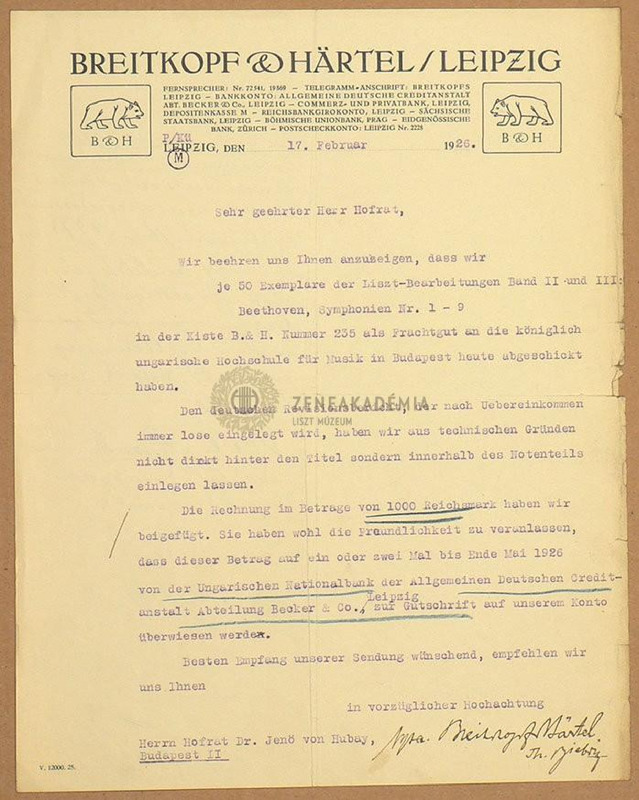 A Breitkopf és Härtel cég levele Dr. Hubay Jenőnek a Liszt-összkiadás 2-3. kötetének (Beethoven szimfónia-átdolgozások, Nr.1-9.) 50 példányban való elküldéséről és az 1000 márkás számla mellékeléséről, és az átutalás módjáról.