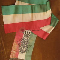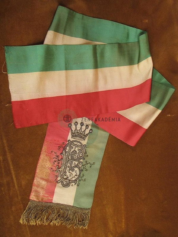 Nemzeti színű selyem ripsz szalag ezüstszálas hímzéssel: 1) MJ monogram, 1884 April 5 évszám 2) LF monogram ötágú koronával