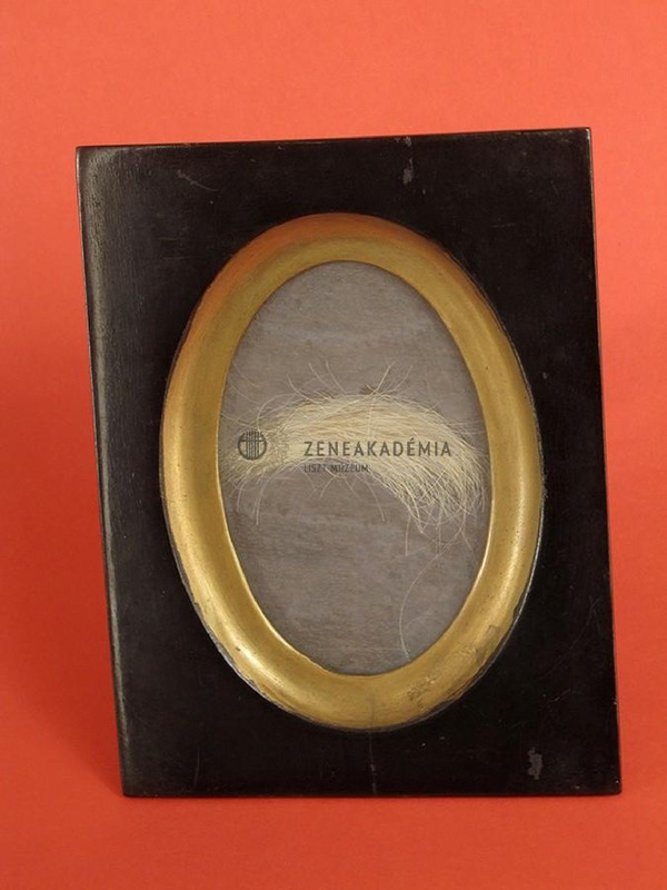 - Az idős Liszt hajfürtje fekete, aranyperemű keretben.