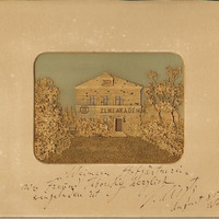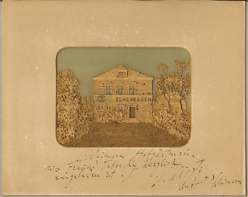 A weimari Hofgärtnerei képe parafából és faháncsból kivágva, kartonra ragasztva. Liszt sajátkezű soraival a paszpartún: "Weimarer Hofgärtnerei wo Freund Taborsky herzlich eingeladen ist. F. Liszt. August 85 - Weimar."