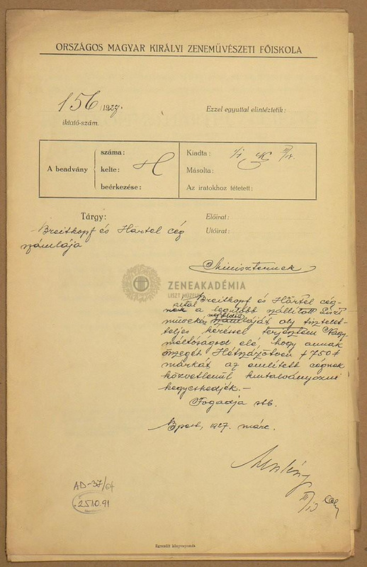 A Zeneakadémia felterjesztési beadványa a vallás-és közoktatási miniszternek arról, hogy a Breitkopf és Härtel cég 750 márkás számláját a Liszt-összkiadás köteteiért egyenlítse ki.