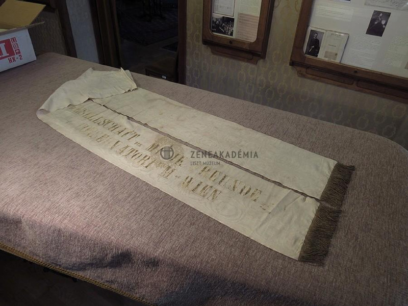 Aranyrojtos, vajszínű selyem ripsz-szalag, arany felirattal: "Gesellschaft der Musikfreunde, Conservatorium - Wien".