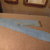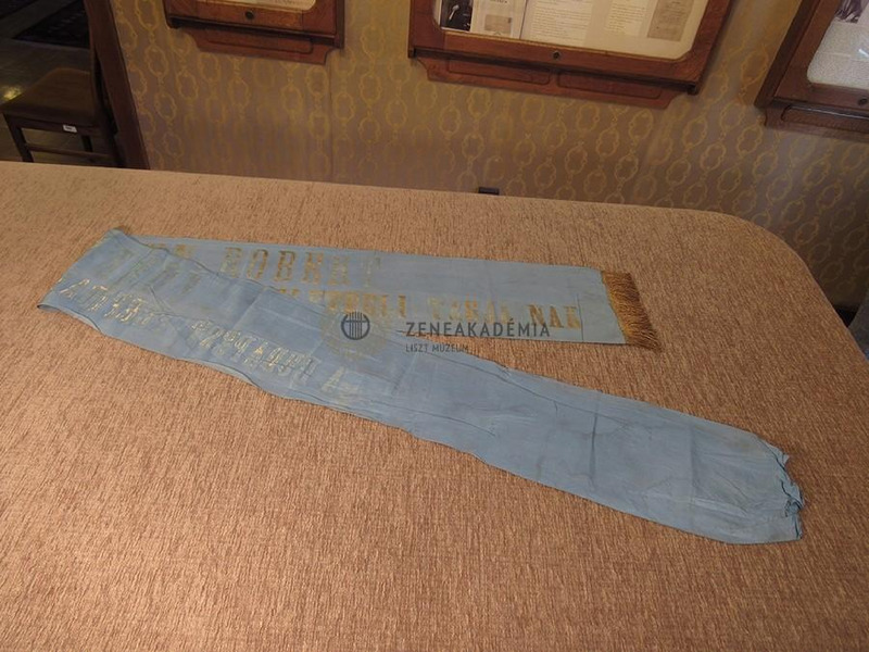 Aranyrojtos kék selyem ripsz szalag arany felirattal: "VOLKMANN RÓBERT A Budapesti Férfidalárdaegylet tiszteletbeli tagjának".