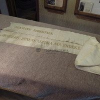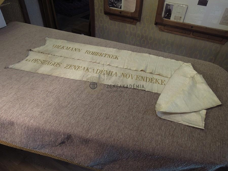 Vajszínű selyem ripsz szalag arany felirattal: "Volkmann Róbertnek - m. k. Országos Zeneakadémia növendékei"