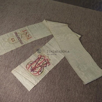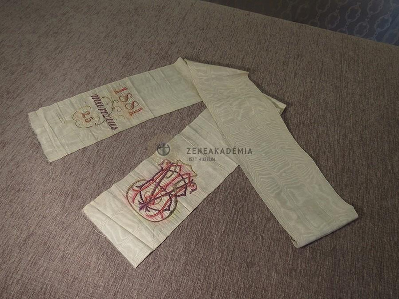 Vajszínű selyem ripsz szalag, hímzett monogrammal és felirattal: "1881 március 25"