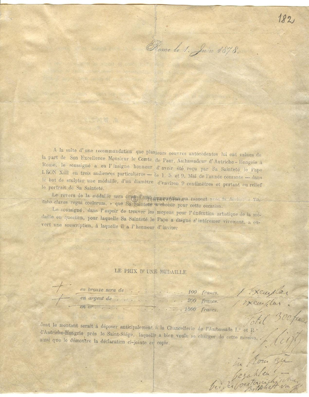 H. Wittig éremkészítő megrendelő íve XIII. Leó pápát ábrázoló érmére L. Paar gróf 1878 május 16-án kelt ajánlásával.